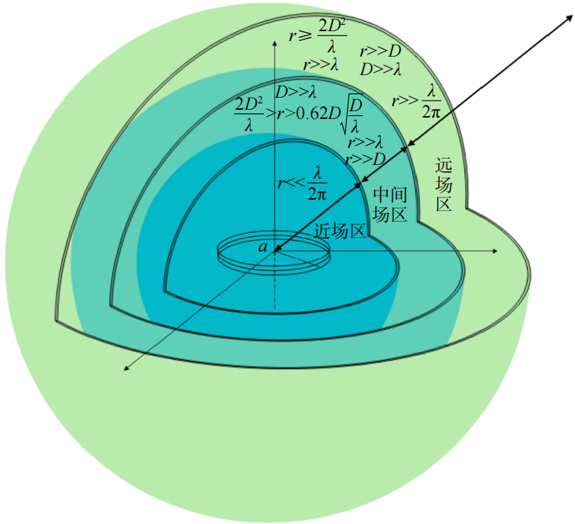 2)中间场区:作为远场区与近场区的过渡区域,其性质与远场区类似。除电磁波在空间角与特定径向上未解耦,很多远场区的性质与概念均可延伸至该区域,但部分模糊性质有待进一步细化与研究。