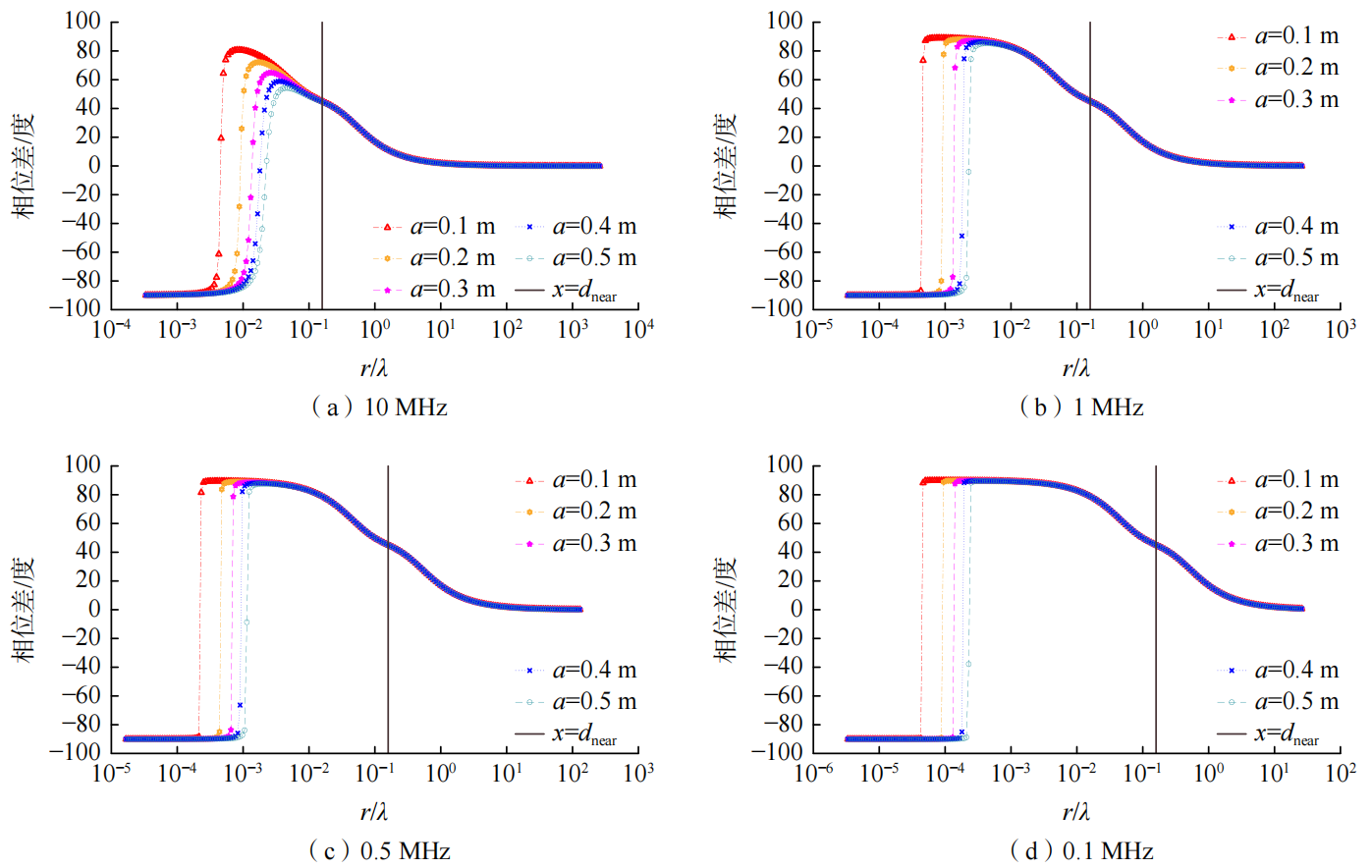 需要注意,不同信号频率和线圈半径不会影响磁感应边界处电磁场稳定的条件,因此,相位差同样可以作为一个验证参数,用于说明磁感应边界两侧的性质。然而,信号频率和线圈半径会影响相位差的收敛速度,线圈半径越大或者信号频率越高,相位差衰减速度越慢。这进一步说明环参数是指导磁感应通信与设计的关键因素。