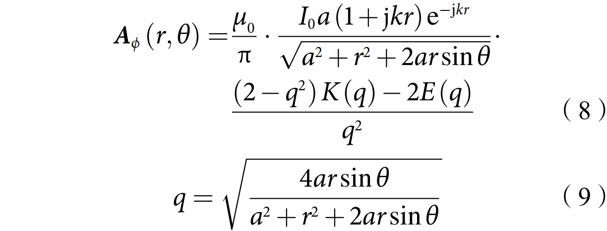 ;为发送磁天线线圈上一点到接收天线中心点的距离;θ为空间角;k为自由空间中的波数;j表示虚数单位;μ0为真空中的磁导率;a为薄环形天线的圆心至天线外绕线的距离。