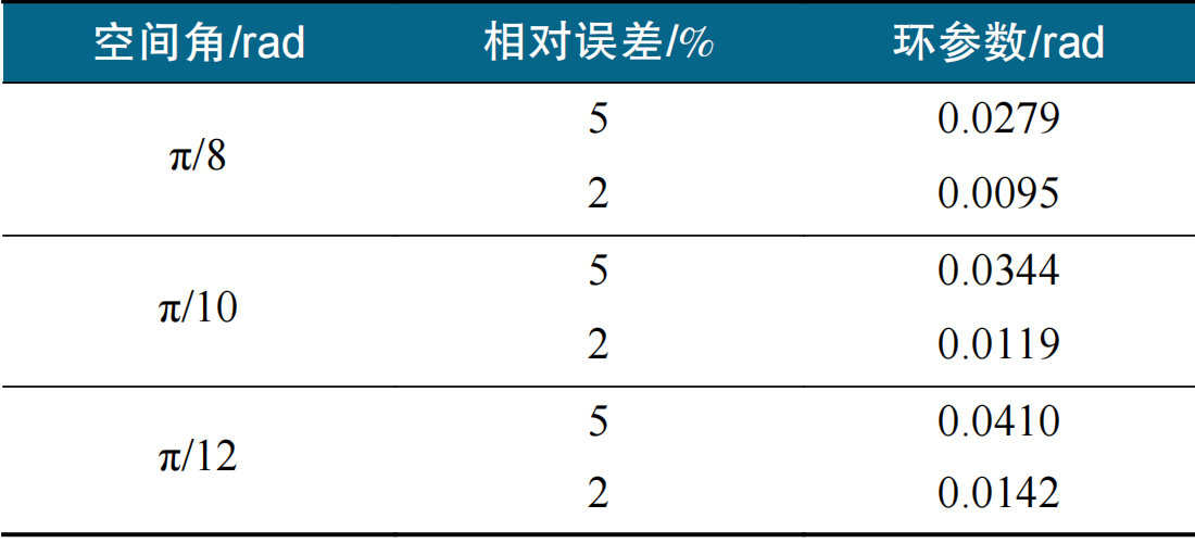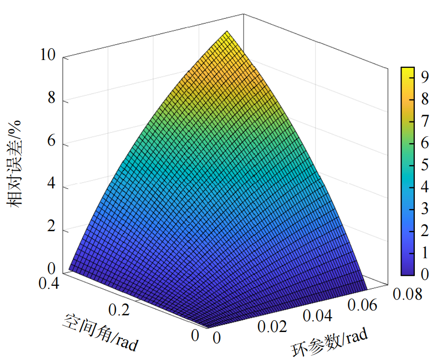 通过对2.2.2节提出的相对误差估计器进行数值仿真,综合分析环参数和空间角对相对误差的影响,结果见图5。利用二阶多项式拟合相对误差与环参数的关系,求得设定相对误差容忍界限下环参数的取值范围。