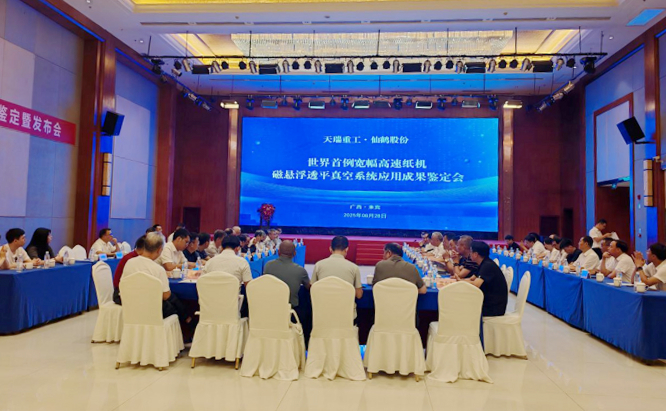 近日,由中国轻工业联合会组织的,山东天瑞重工有限公司、仙鹤股份有限公司主办的宽幅高速纸机磁悬浮真空泵系统应用成果鉴定会暨发布会在来宾市举行。