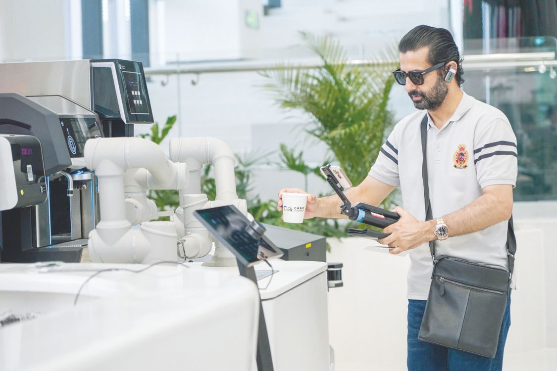 在南A中心展示中心,参观人员记录下咖啡机器人制作咖啡的过程。