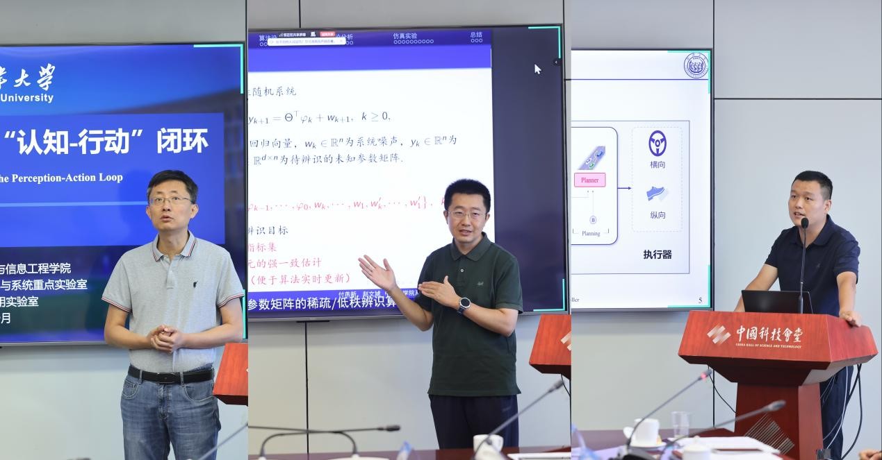 主旨报告环节,天津大学电气自动化与信息工程学院教授左志强以“具身智能实践:打造‘认知—行动’闭环”为题,提出智能无人系统的发展应从算法驱动迈向系统级工程突破,通过仿真—现实闭环验证、多学科交叉协同与产业应用反馈,可不断提升系统可靠性与适应性,为未来技术发展和产教融合提供新思路。中国科学院数学与系统科学研究院研究员赵文虓作“非平稳随机系统未知参数矩阵的稀疏/低秩辨识算法”报告,介绍了一种通过正则化递推最小二乘与阈值算子相结合,实现参数稀疏模式的准确辨识的创新的在线辨识算法,为复杂系统建模、控制及人工智能模型压缩提供新工具与新路径。同济大学汽车学院副教授褚洪庆以“数据机理混合的智能电动汽车底盘状态估计与控制”为题,分享团队在该领域的重要研究成果,系统介绍估计—控制与上游感知规划一体化网络、神经网络—卡尔曼滤波器联合估计,以及基于神经网络求解器的底盘运动预测控制等智能电动汽车底盘系统的创新研究方法,提出了数据驱动与机理模型深度融合的技术路线,为提升车辆智能化控制水平提供新的解决方案。
