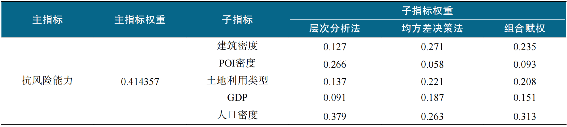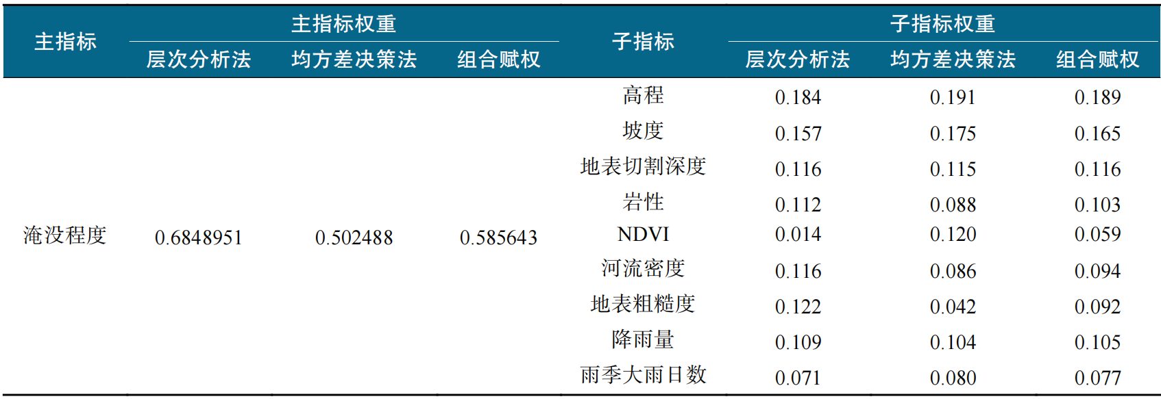 式中,wH为淹没程度主权重;wv为抗风险能力主权重;R为洪涝灾害的风险。