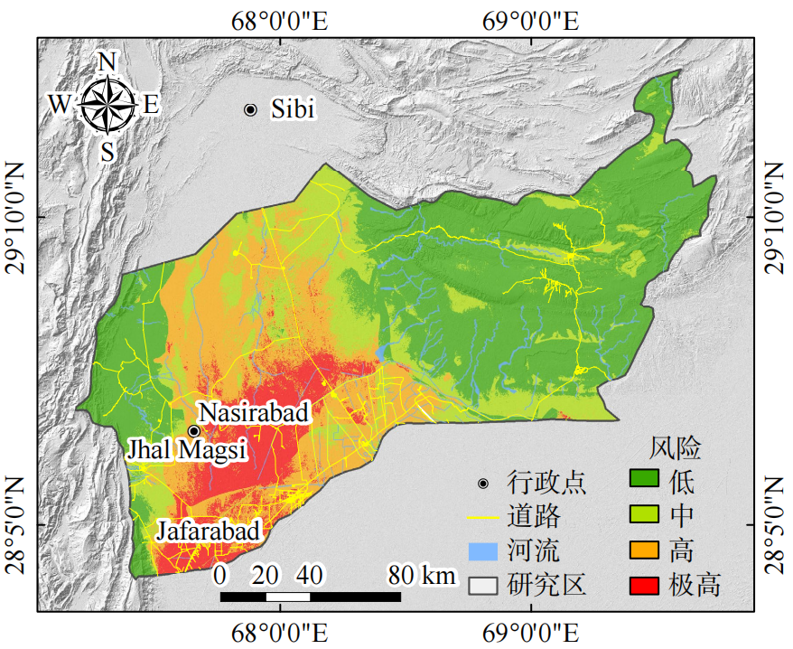 通过式(15)、表2和表4计算巴基斯坦山前平原区洪涝淹没程度与抗风险能力结合下的风险值,利用自然断点法得到研究区洪涝灾害风险评估(图10)。经分析,研究区中极高风险占10.21%,分布于Nasirabad西南、Jhal Magsi南部,该区域处于降雨大、降雨时长多的区域,地势低洼,耕地多,河流湖泊较少,泄洪能力弱,洪水易聚集,洪涝淹没程度大,且该区域内建筑较多,人员分布较广,耕地多,经济财产破坏较大,这些区域一旦遭受暴雨袭击,将会面临被洪水完全淹没造成重大财产损失的威胁;高风险区占17.87%,主要分布于Jafarabad全境、Jhal Magsi东部,该区域农田多,地势低,降雨天数多但不集中,洪涝灾害易发,但该区域内人员密集分布,基础设施建设较为完善,水系沟渠建设较多,洪水容易排泄,相对于极高风险区威胁较低(图11)。