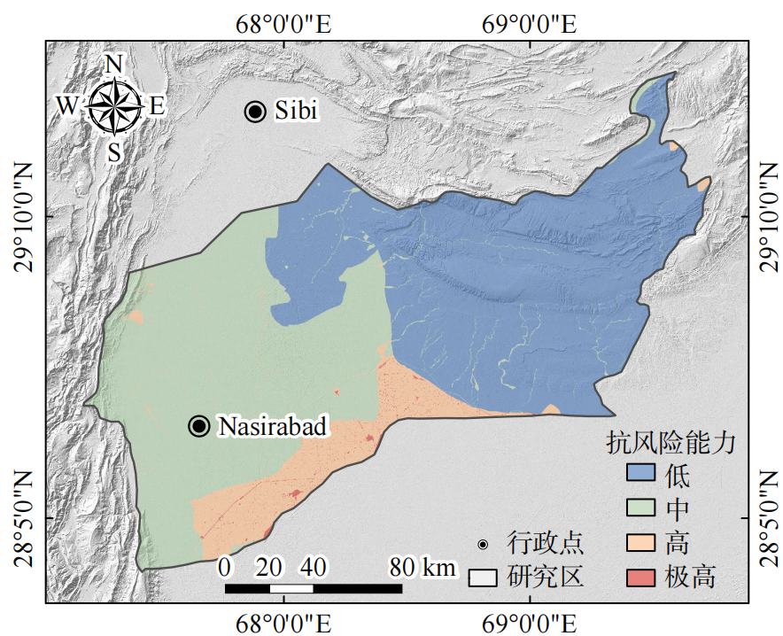 其中GDP和人口数据主要来源于巴基斯坦年鉴下市级尺度的数据统计,根据洪涝时期高分遥感影像对地表覆盖类型解译获得土地利用类型和建筑密度,因人口数据为市级尺度,精度较差,目前可通过高德地图对外开放的应用程序编程接口(API)免费获得带属性信息(坐标、名字等)的POI数据,能够获得包括餐饮、景区、医院、政府等一些与生活密切相关的地标建筑和地理实体的点数据,因此本文通过python,利用OSMnx库和高德key,获取研究区POI数据,提高人口分布的准确度。利用式(12)计算抗风险能力指标权重(表4),利用式(14)计算研究区抗风险能力(图9),结果显示,研究区域的GDP、人口密度、建筑密度以及POI密度相对较高区域集中在Nasirabad南部区域,土地利用类型主要是建设用地与农田用地(图8)。抗风险能力高及以上的区域集中在研究区南部,该区域人员聚集、基础设施建设全面、水库池塘较多。抗风险能力较低的区域在研究区中北部,该区域人员分布较少,基础设施建设较为落后,大多属于山地丘陵地区。
