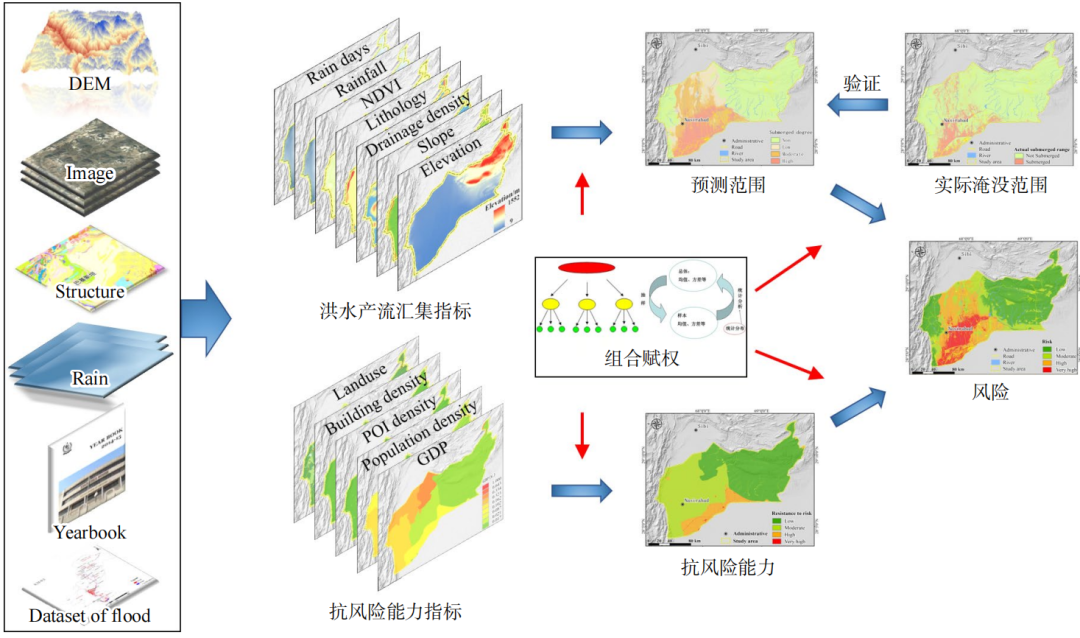 在洪水发生初期,准确地预测洪水的范围对于灾害评估、紧急救援行动以及资源合理分配至关重要。在洪灾发生前的预测方面,一种常见方法是采用地理信息系统(GIS)和暴雨水文模型(SWMM)的联合应用,这种方法可以用来计算城市地区的洪水范围和深度,从而建立城市暴雨淹没分析模型,以及根据以往洪涝灾害样本构建S型函数对未来情况进行预测,同时,洪水脆弱性和危害标准可以用来生成洪水风险图,辅助洪灾预测工作。此外,GIS和层次分析法已被应用于洪水灾害风险评估。同时,合成孔径雷达(SAR)技术和深度学习方法也被广泛利用,以提取洪水淹没范围的相关信息。洪涝灾害评价体系的建立可以实现区域灾害风险的可视化。现有对区域洪灾受损情况研究主要集中在2个方面,一方面是构建快速预测洪灾损失的评价模型,能够定量预测洪水对特定地区的损失情况;另一方面,基于水深的单变量确定性水损失模型与基于过程驱动与数据驱动的径流模型也得到了广泛研究,通过研究不同重现期洪水所引发的直接损失,以估算潜在的洪水损失。此前的研究主要通过地形因素对洪水淹没可能性进行预测,或结合年降雨数据进行预测,未能反映一次淹没事件前后短期降雨下的淹没程度,而洪涝灾害的发生不是单一影响因素作用的结果,其受到多种地形、气候等因素的影响,因此,如何全面考虑这些洪涝灾害的影响因素,并对受灾范围以及受灾程度进行准确预测,目前还具有一定的不足。