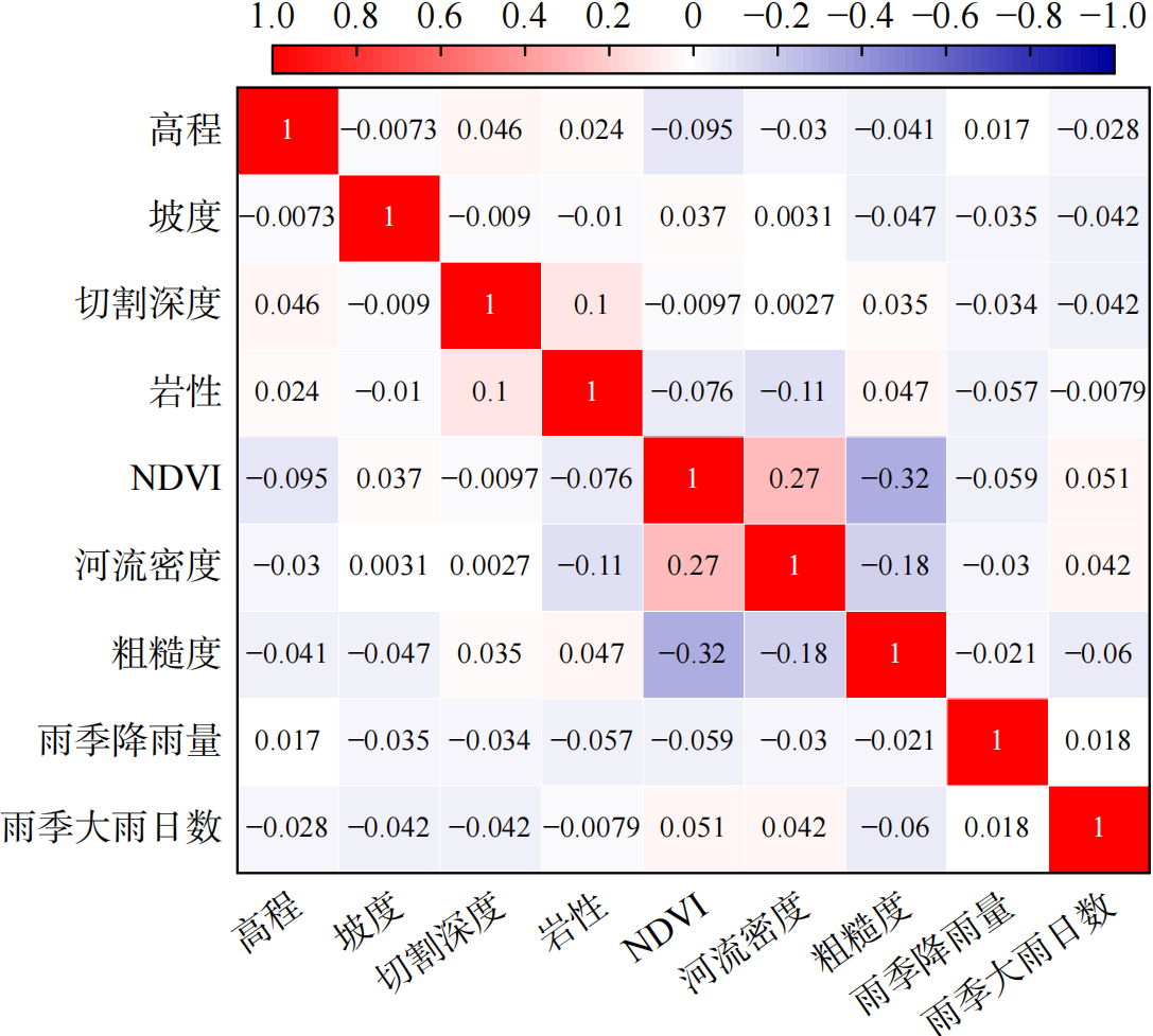 影响流域产流汇集的形成洪水的因素有2个,即下垫面和气象。连续强降雨为致灾因子,即为气象因素,包含降雨量和降雨时长,本文选择雨季累计降雨量和雨季累计大雨降雨日数作为气象因素评价因子。雨季累计降雨量反映了在整个雨季内降水的总量,是衡量一个地区在特定时间段内总体水分供应情况的关键指标,较高的累计降雨量通常意味着该地区在雨季期间承受了大量的降水,可能导致土壤饱和、河流水位升高以及潜在的洪水风险增加。雨季累计大雨降雨日数用于衡量大雨,频繁的大雨可能使地表径流增加,并减少土壤吸收降水的能力,进一步加大洪水发生的可能性。下垫面因素分为地形参数和地表参数,地形参数包括高程、坡度及地表切割深度,地表参数包括岩性、地表粗糙度及植被覆盖度(图4)。