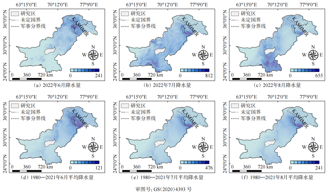 该区域的降雨虽然总体不如山区集中,但其水文响应对山地洪水的影响仍然显著,所处的位置具有典型的山前平原降雨特征,同时该区是受灾严重地区,该区的研究对于理解城市系统的水文响应和灾害风险具有重要意义。地理位置跨越67°11′0.7″E—69°44′11.0″E,27°53′30.2″N—29°41′7.8″N,该地区人口约30万人,主要从事畜牧业和农业,国内生产总值(GDP)约187.6亿元。根据多源加权集合降雨(MSWEP)数据,该地区降雨量超过历史同期2倍。研究还发现,2022年8月印度夏季风指数与该地区降水异常呈显著正相关,尤其在俾路支省存在显著相关区域(图2)。
