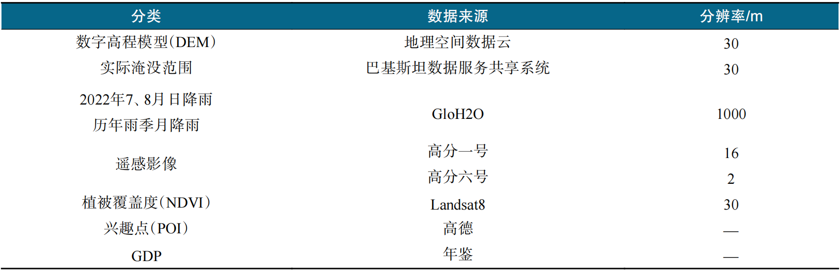 根据此次巴基斯坦异常多次强降雨天气导致大范围洪涝灾害,利用巴基斯坦数据服务共享系统可以查询实时洪水淹没情况,并根据2022年7、8月高分影像对研究区域内受洪水威胁对象进行遥感解译,主要数据来源如表1所示。