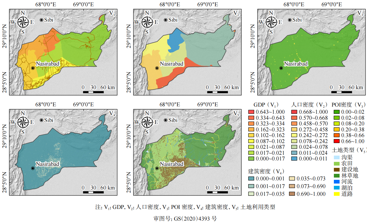 在洪水灾害预测研究中,抗风险能力通常指一个区域、社区、基础设施或生态系统在面临洪水灾害时,能够有效抵御、应对、减轻影响并迅速恢复的能力。此次巴基斯坦山前平原洪涝灾害带来的损失主要体现在社会易损、经济易损、人口易损、物质易损方面,因此本文选取GDP、人口数据、土地利用类型、建筑密度和POI数据为抗风险能力指标(图8)。GDP作为国内生产的广泛指标,它为特定城市区域的经济状况提供了全面评估。人口密度指的是每单位土地面积内居住的人口数量,是评估特定国家或地区居民空间分布的重要指标。土地利用类型反映土地利用特征、自然属性和分布模式的基本区域实体。建筑密度表示建筑物覆盖面积的程度,这一测量指标反映了指定土地区域内的开放空间和建筑密度。兴趣点(POI)指的是代表对人们日常生活产生直接影响的重要地标和实体的地理坐标,包括教育机构、医疗设施、商业中心和娱乐区域等。它在某种程度上反映了城市活动的多样性。