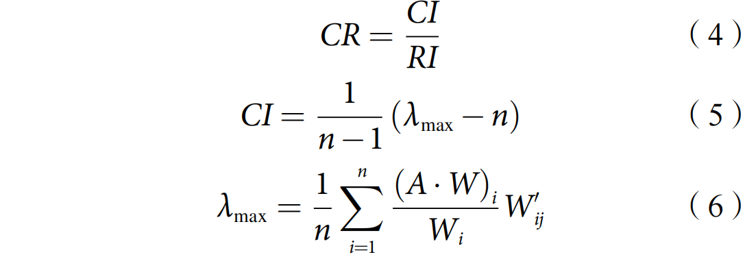 式中,CR为一致性比率,结果表示CR<0.1时,矩阵的一致性检验合格;n为两两比较的元素个数;CI为一致性指标;RI为随机一致性指标;λmax为最大特征值;(A·W)i为A·W的第i个分量。