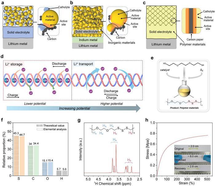 针对这一难题,金属所研究团队制备出一种在分子尺度上实现界面一体化的聚合物材料,兼具快离子传输能力与高效的离子存储功能。该材料通过共价键,将快速的“离子传输通道”和具有储能功能的“硫链结构”集成在同一聚合物结构中,从而将离子传导与存储功能“合二为一”,有效改善了固态电池中界面传输困难的问题。