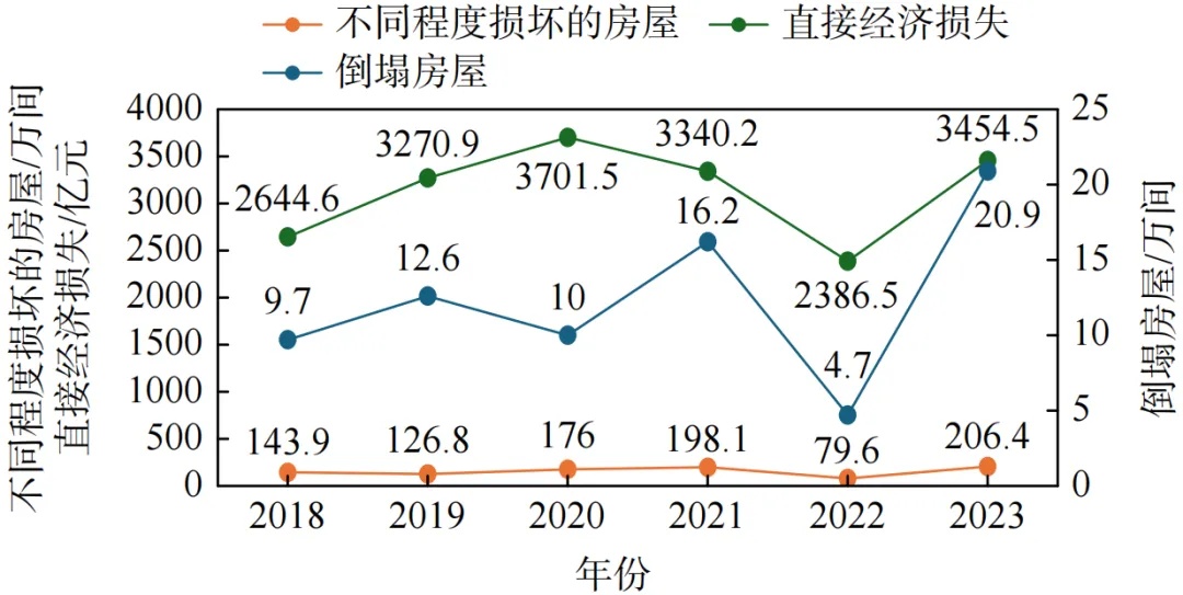2018—2023 年全国自然灾害房屋受损情况(数据来源:中华人民共和国应急管理部统计数据)