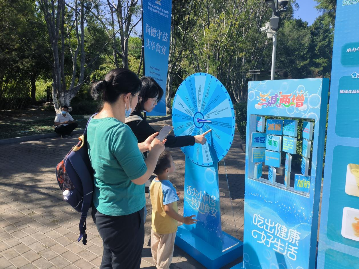 “食安趣味探秘坊”中,“幸运大转盘”和“知识翻翻乐”两大游戏区域笑声不断。家长与孩子共同转动大转盘,一起回答食品安全常识问题,在协作中强化健康认知;“翻翻乐”游戏则通过趣味翻板形式,普及“减油、减盐、减糖”和“减油增豆加奶”膳食理念。不少家庭反复参与,在游戏中轻松记住复杂知识,现场气氛热烈。