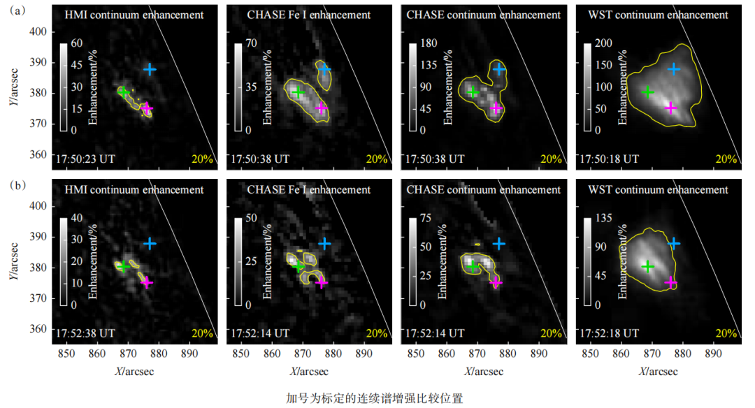 作为WLF重要成果的组成部分,Li等对WST/LST观测到的一个C2.3级WLF(SOL2022−12−20 04:10 UT)开展个例研究,辅以CHASE和HMI观测,获得了在宽波段范围连续谱的增强: