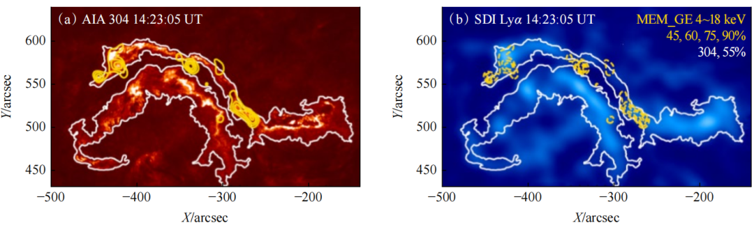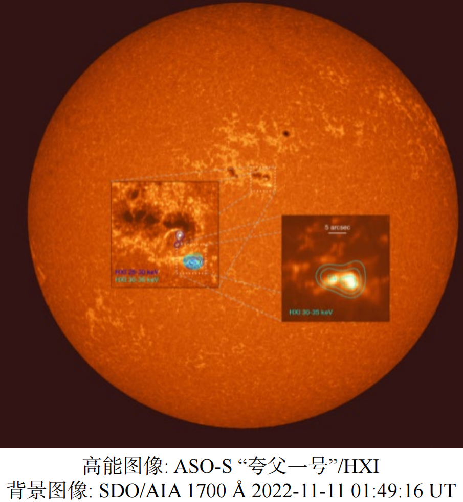 结合HXI对该耀斑的观测,发现白光增强区与HXR足点在空间位置上相一致,说明是非热电子束加热大气深层致连续谱增强。