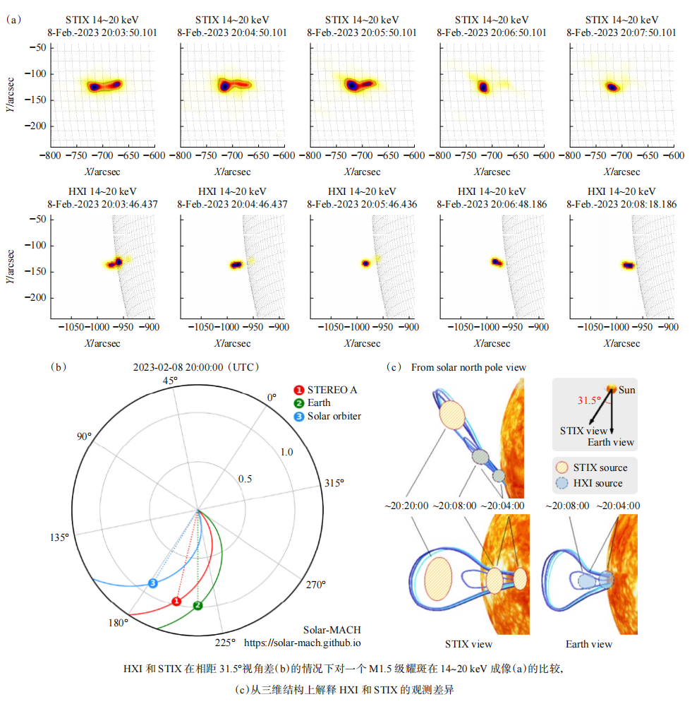 自从HXI投入观测以来,HXI与STIX同时观测到的耀斑已达数百例,其中不乏时间结构完整和观测视角合适的事例。结合能谱和图像交叉定标结果的进展,这些事例为接下来的立体成像联合诊断耀斑加速粒子机制和三维结构提供了史无前例的机会。Mrozek等对一个失败暗条爆发所伴随的M1.5级耀斑(SOL2023−02−08 20:05 UT)初步尝试了HXI和STIX立体观测三维形态诊断研究,当时ASO−S和SolO观测的夹角为31.5°,如此大的夹角足以反映立体探测形态上的差异。图9显示了HXI和STIX各自成像的结果(图9(a)),图9(c)是卡通式解释两者观测结果在三维结构上的一致性,即HXR源所在的耀斑环并不垂直于太阳表面,两者观测的自洽性可以定出耀斑环真实的三维结构。