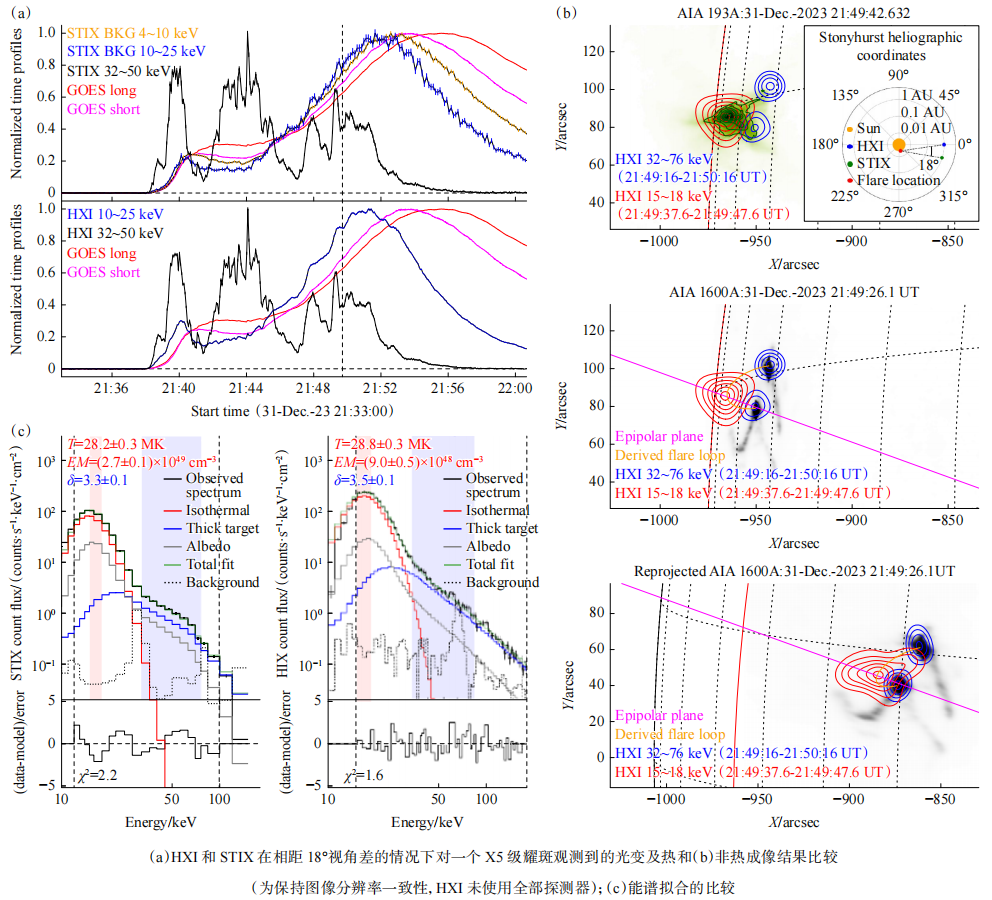 Ryan等研究了HXI和STIX同时观测到的另一个X5.0级大耀斑(SOL2023−12−31 21:55 UT),ASO−S和SolO当时观测视角差为18°,虽然视角差不大,但HXI和STIX的观测时间段相对完整,成像细节上的差异仍能反映出三维几何信息,联合HXI和STIX立体成像(图10),精确获取了热环顶源和2个非热足点源的位置,得到耀斑环为椭圆几何形状且与法向存在22.8°的夹角。随着仪器交叉定标的完善,三维联合观测研究将呈现更多重要的结果。