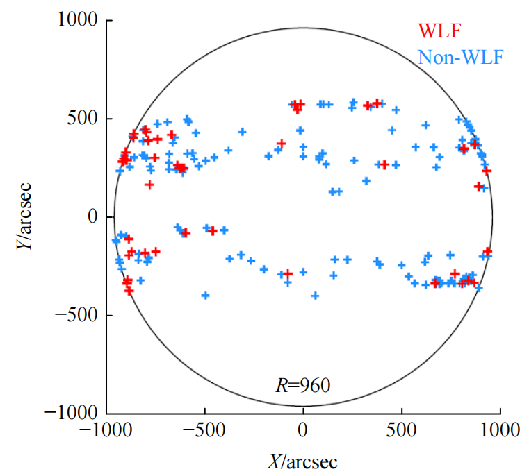 白光耀斑(WLF)研究应该是现阶段ASO−S卫星的一个标志性观测研究成果之一。众所周知,WLF曾经被认为是一个比较罕见的现象,后来随着观测事例逐渐增多,WLF慢慢褪去神秘的面纱,但实际上,有关WLF的观测和研究非常有限。Jing等利用WST/LST最初约7个月的观测数据,提取了共205个M1.0以上耀斑,从中发现有49个耀斑存在360 nm连续谱增强,即23.9%的M1.0级以上耀斑是WLF,这一结果给出了白光耀斑不再罕见的一个具体指标,Solar Physics主编为此推荐该文为亮点文章。此外,他们还发现耀斑级别越高,是WLF的概率越大,大于X1.0的7个耀斑样本均是WLF;360 nm连续谱增强平均为19.4%;平均持续时间为10.3 min;平均增强和平均持续时间均与SXR峰值流量具有一定的相关性;连续谱增强的峰值在时间上与HXR峰值相对应;WLF呈现边缘增多(图12)且连续谱增强也临边变大的趋势等。这一系列的结果,大大丰富了人们对WLF,特别是对巴尔末连续谱WLF的认识。