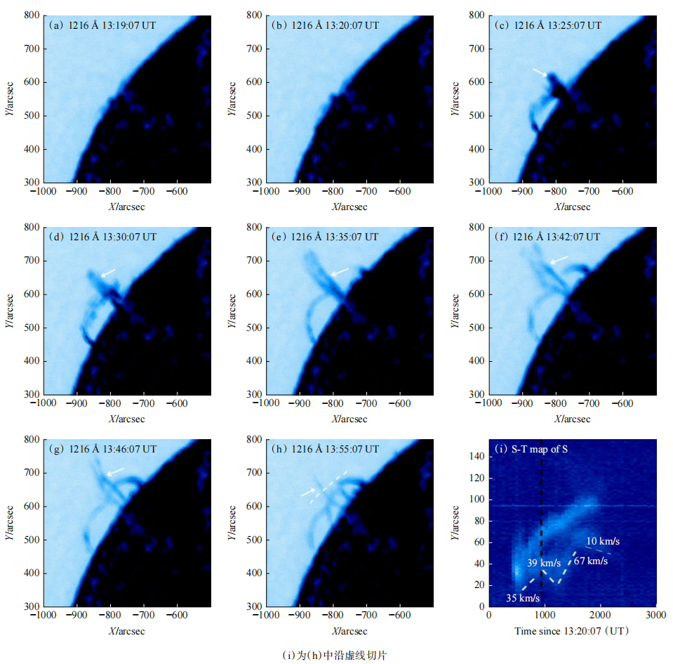 Xue等研究了2022年10月26日2个感应的失败日珥爆发(图16),这也是LST开机后最早观测到的莱曼阿尔法日珥案例。2个看似无关的日珥实际上联系紧密,南边的日珥由于Kink不稳定性而爆发,解扭曲过程中形成下面的耀斑带,但随后发生的磁重联使得爆发失败。南边的日珥上方与北边的日珥有磁流管相通,爆发带动北面的日珥也出现上升,但由于南面日珥爆发出现的质量“真空”,使得北边日珥的物质通过磁流管灾变式向南边日珥排放。这就提出了一个新的图像,日珥爆发可以终止于通过磁流管的质量排放。