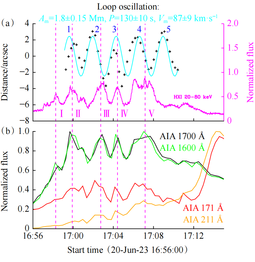 HXR的QPP受到很多人的关注。Li等和Shi等分别研究了HXI观测到的另外2个X级耀斑的QPP:X1.1(SOL2023−06−20 16:42 UT)和X1.2(SOL2023−01−06 00:57 UT)。结合AIA/SDO等其他观测,前者呈现出日冕环的无衰减Kink震荡,先后连续5个脉动振幅没有明显衰减(图8),紫外、HXR、微波等多波段光变均显示周期在100~130 s的QPP特征,不同温度的日冕环具有相同周期的震荡且与脉冲相HXR的QPP同时观测到,意味着能量的重复释放是触发这类QPP的主要原因;后者从HXI对足点成像中找到约27 s的HXR QPP,且与HXR流量成负相关的HXR能谱指数也呈同周期QPP特征,说明注入耀斑环足点的非热电子束本身是观测QPP的原因。一个对HXI观测到的更长准周期(200s)X6.4耀斑(SOL2024−02−22 22:08 UT)研究也显示,其QPP同样是由周期性磁重联致电子加速所造成的。