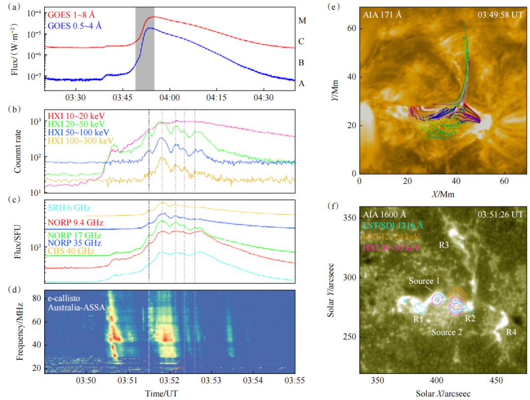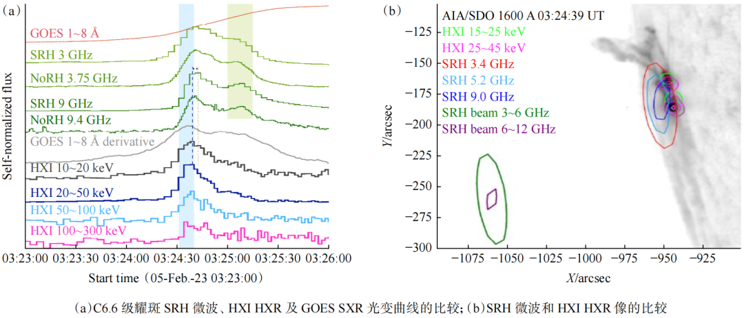 Shamsutdinova等利用西伯利亚射电日像仪(SRH)和HXI对一个C6.6级东边缘耀斑(SOL2023−02−5 3:36 UT)的同时观测,研究了耀斑能量释放过程的自洽经验模型。通过对微波和HXR能谱和成像的分析,得到耀斑主要能量释放结构是一个致密的环,谱分析显示耀斑早期是热辐射,很快由加热转为粒子的加速,推求的微波和HXR能谱一致性说明它们来自同源的加速粒子束,且呈现典型的软硬软变化特征。图11显示了该耀斑SRH微波、HXI HXR及GOES SXR光变曲线的比较,以及SRH微波和HXIHXR像的比较。Kuznetsov等对SRH观测到的一个M5.8耀斑(SOL2023−03−06 2:32 UT)以及Wu等对SRH观测到的一个M6.5耀斑(SOL2023−05−09 03:54 UT)研究中也使用了HXI的观测,前者阐述了耀斑与暗条爆发的关系,后者揭示耀斑加速电子起源于环顶。