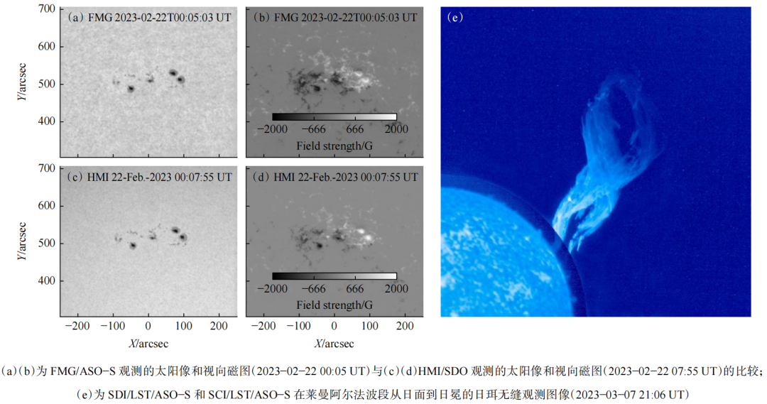 图1显示了HXI/ASO−S早期观测的一个耀斑(2022−11−11 01:49 UT)HXR像(等值线)叠加在AIA(大气成像组件)171/SDO(太阳动力学天文台)像上,展示了HXI的成像能力及空间分辨率;图2显示了SDI/LST和SCI/LST在莱曼阿尔法波段从日面到日冕的日珥无缝观测图像举例(2023−03−07 21:06 UT),以及FMG/ASO−S观测的太阳局部像和视向磁图与HMI(日震与磁场成像仪)/SDO观测的太阳像和视向磁图比较(2023−02−22 00:05 UT)。