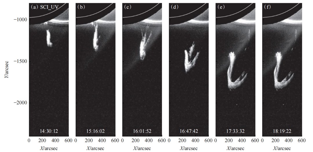 此外,Zhang等在多波段研究耀斑触发的EUV波引起周边宁静暗条震荡时用到SDI观测到的光变曲线;宁静暗条随后失去平衡,上升到SCIUV/ASO−S观测到的直至2.2个太阳半径处的形态(图19),进而形成一个典型三分量结构的CME;Chi等研究了相继发生的3个CME及激波与CME的相互作用,其中SCIUV/ASO−S观测到第2个CME形成早期的形态。