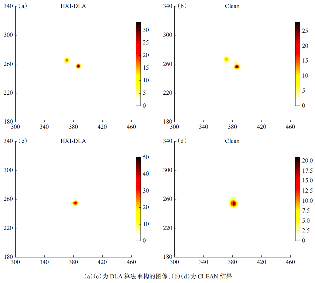 Xia等提出了一个基于深度学习的图像重构新算法(DLA),通过HXI光栅响应函数和模拟观测数据构建训练集,获取满意的深度学习模型,进而应用到HXI实际观测的耀斑事例中,所得耀斑硬X射线图像与传统方法CLEAN所得结果可以相比拟甚至更好(图6),成像过程速度极快且无需额外参数。基于深度学习的该算法的提出是国际上首次,经过进一步的改进和完善,将为用户提供一个全新的选择,成为HXI图像重构的基本软件之一。