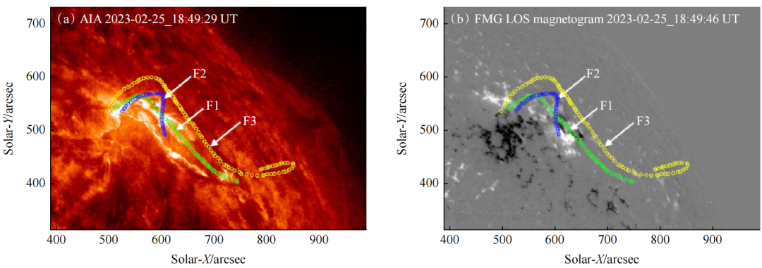 Song等研究了一个初始过程不同于以往的特殊暗条爆发,横跨活动区的大尺度暗条的爆发受到下面2个稍小尺度暗条爆发的驱动,如此多暗条爆发还导致了一个M6.4级耀斑的产生,AIA观测到的暗条叠加在FMG视向磁图上(图4)清楚显示出暗条与磁场的空间位置关系,暗条F1和F2先爆发,F1、F2及与大暗条F3的相互作用致F3爆发,该事件还伴随着一个晕状CME,并产生了强烈的地磁效应。这类爆发不仅为理解太阳爆发提供了一个新的样本,也为从观测上预报空间天气提供了一条新的线索。