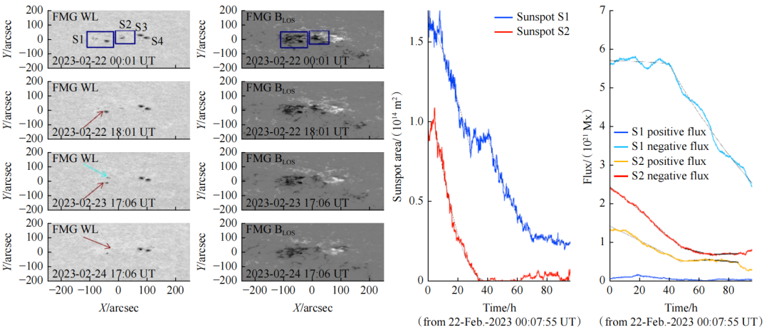 Idrees等利用FMG和HMI观测数据详细研究了活动区NOAA 13229中β型黑子的衰减,包括黑子面积的衰减和磁通量的衰减,分别考察了磁对消、磁消散、碎片化、水平流汇聚和水平流旋转等因素对黑子衰减的影响,不同黑子的衰减主导机制可以不同,衰减时间也大不相同,如图5中的S2黑子的衰减中磁对消发挥主要作用,而S1黑子的衰减则是碎片化和磁消散起主要作用。