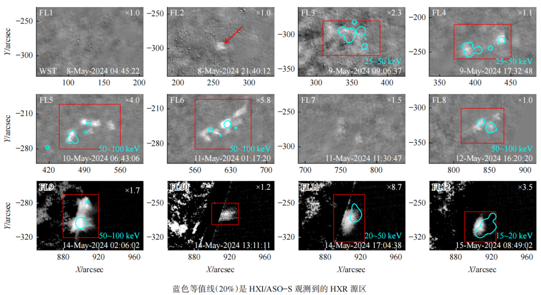 2024年5月,NOAA 13664活动区连续产生了12个X级耀斑,这为研究WLF提供了非常好的样本,Li等发现其中11个有白光连续谱增强,360 nm(WST/ASO−S)和617.3 nm(HMI/SDO)增强区可发生在黑子外、半影区和本影区,可来自耀斑带和耀斑环(乃至物质喷发),且前者的持续时间、强度增强水平,甚至与HXR的关联都比后者要显著。图14显示了WST/ASO−S观测到的这12个耀斑360 nm差分像,图中蓝色等值线(20%)是HXI/ASO−S观测到的HXR源区。