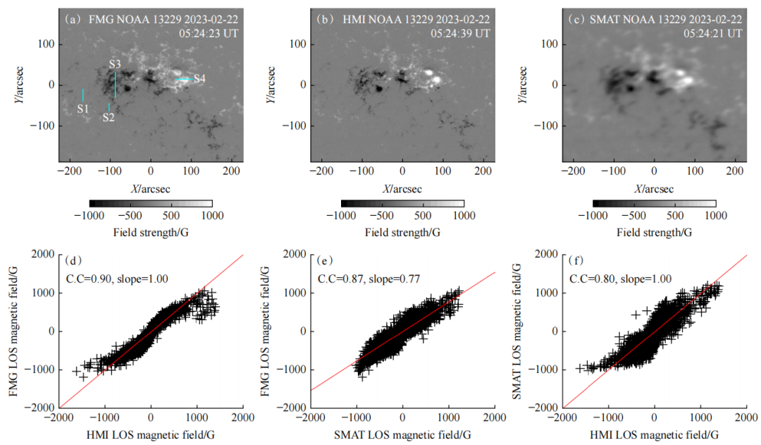 作为磁像仪的FMG,在轨工作后与地面和空间其他磁像仪观测结果的对比,无疑是重要的一步。对于太阳光球磁场,不同的仪器测量结果应该大体一致。Xu等将FMG的观测与HMI以及怀柔地面磁场望远镜(SMAT)的观测进行了对比,发现3台设备对太阳视向磁场结构和空间分布的观测结果基本一致,磁场相关系数达到0.9;如果只考虑黑子半影,视向磁场相关系数则达到0.98;在太阳宁静区,FMG比HMI更能观测到弱的磁场信号,说明FMG具有更高的磁场信号灵敏度。图3给出了一个例子,显示了FMG与HMI、FMG与SMAT以及HMI与SMAT的磁场相关性比较。正如前文所述,由于饱和的原因,FMG对黑子本影视向磁场强度的测量显得比HMI的测量结果要弱。