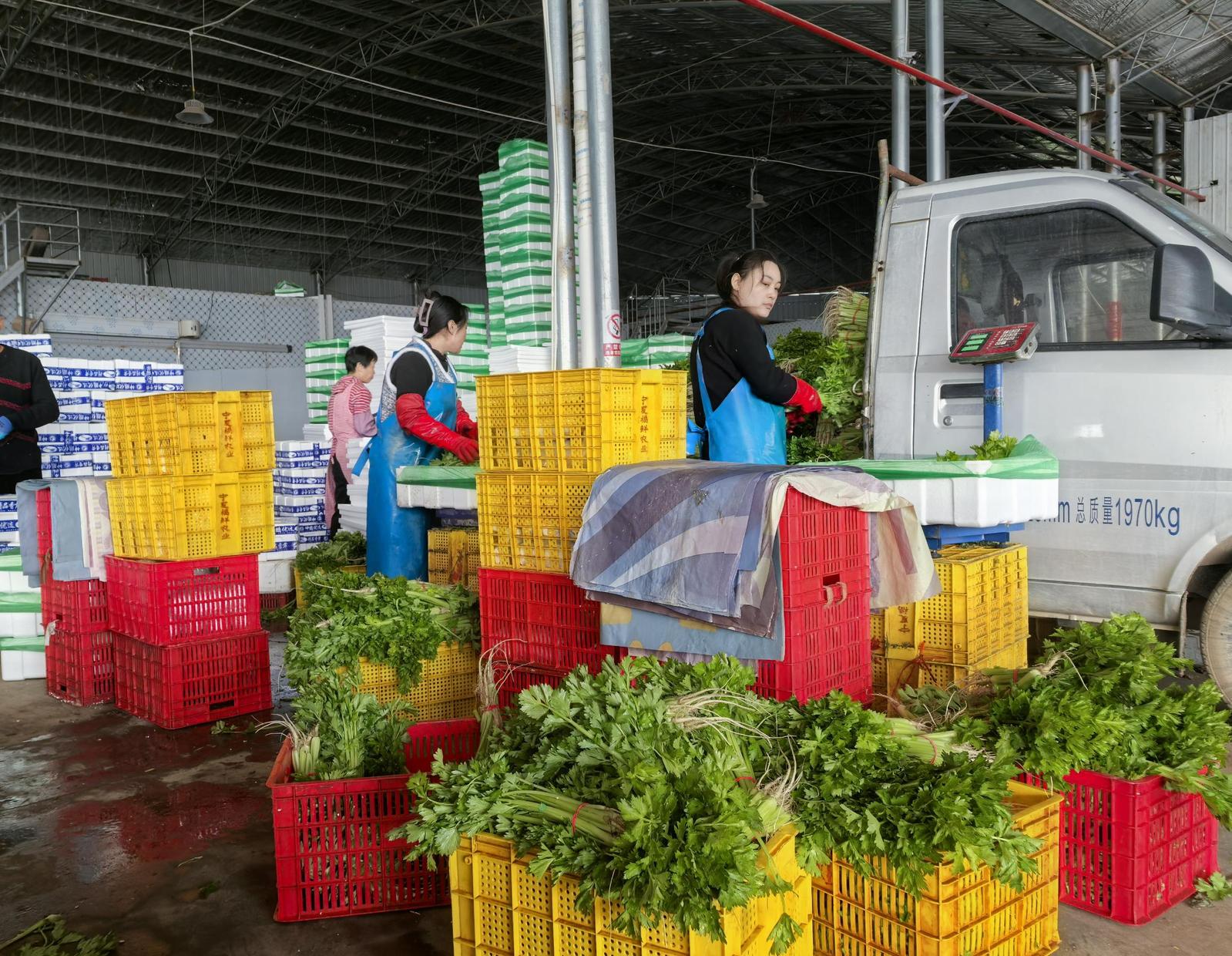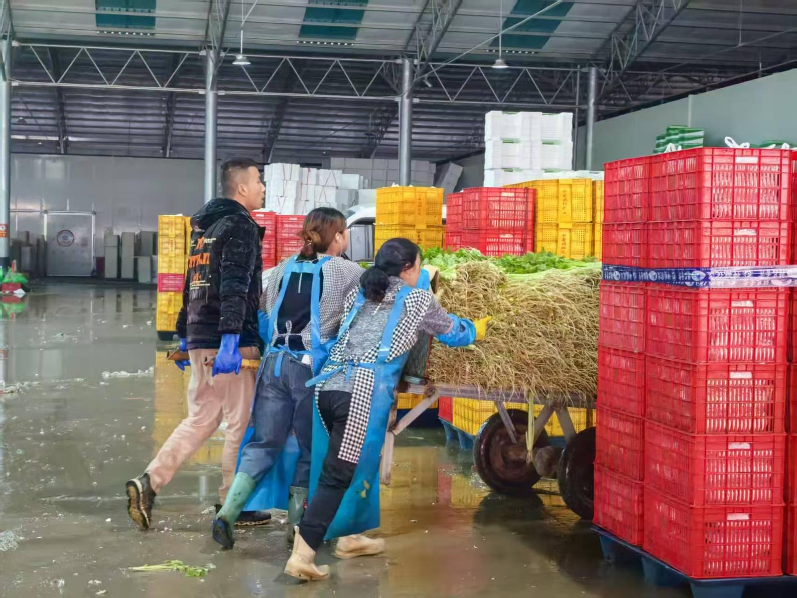 集配中心内工作人员对每一箱香芹进行称重登记。