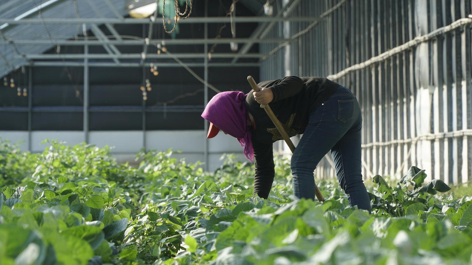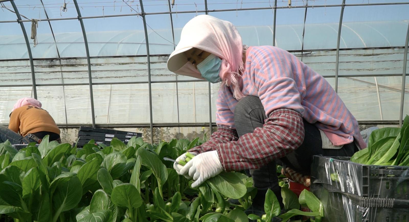 贺兰县宁夏自然之星公司内正在采摘菜心的农户。