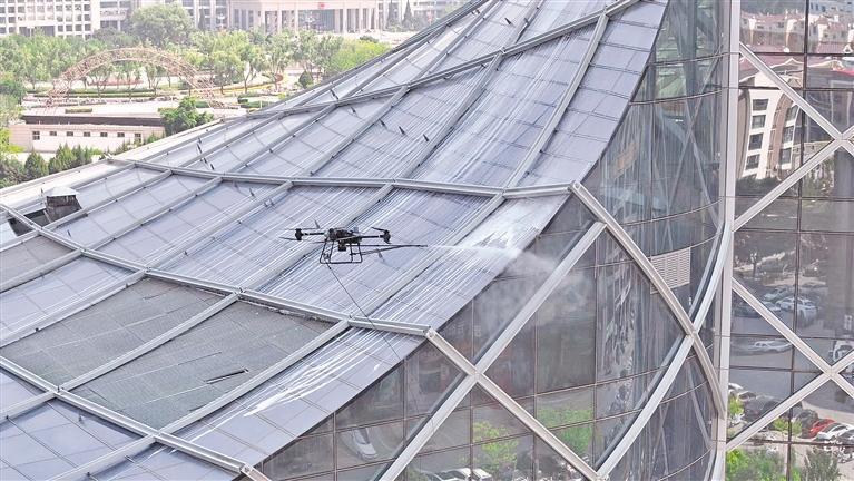 无人机“上岗”清洗酒店玻璃幕墙。 宁夏日报记者 杜晓星 实习生 彭斌 摄