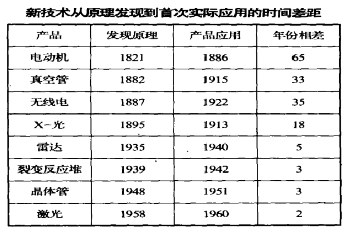 7.物理学和技术之间的迅速反馈循环,是二十世纪一个明显的现象。我们只要想到用电量的大幅度增加、通讯工业以至电脑工业的诞生,便会了解现代社会多么依赖物理学研究的最新进展。而“物理—技术一物理”循环的速度已大大增加了。附表显示,由发现电动机的原理到第一次使用电动机需时六十五年;但对激光来说,所需时间只不过是两年而已。虽然很难设想,这循环时间可以再大大缩短,但每年成熟、面世的重要新技术肯定会继续增加。这些我们今日连其名称都还无从想像的未来技术将要对二十一世纪人类的命运发生深远影响。