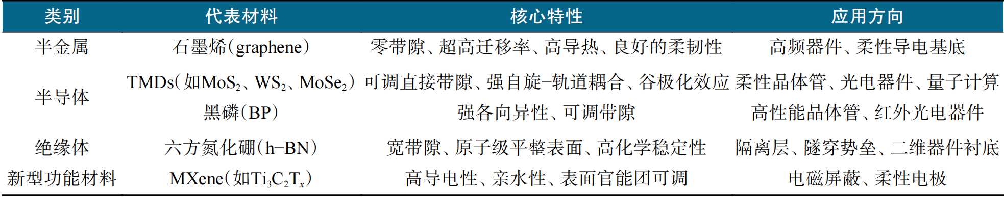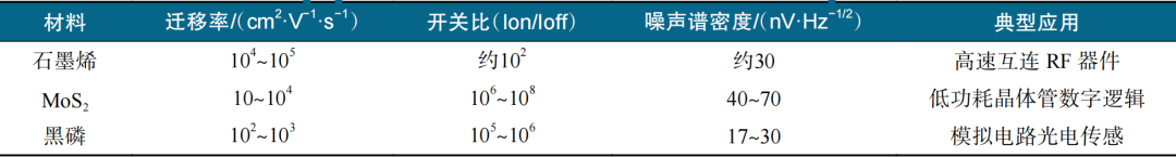典型二维材料的性能对比见表2。石墨烯、MoS2和黑磷这三者在性能指标与应用场景上各有长处:石墨烯更侧重于高速低噪声模拟与射频应用,MoS2强调高开关比与光电响应,黑磷则凭借带隙可调与各向异性契合特定探测与模拟需求。未来的研究应该聚焦于带隙工程、界面与接触优化、大尺度均匀生长及封装策略,在兼顾迁移率、功耗与环境稳定性的情况下,加速二维材料在可穿戴电子、物联网与高性能计算等领域的商业化应用。