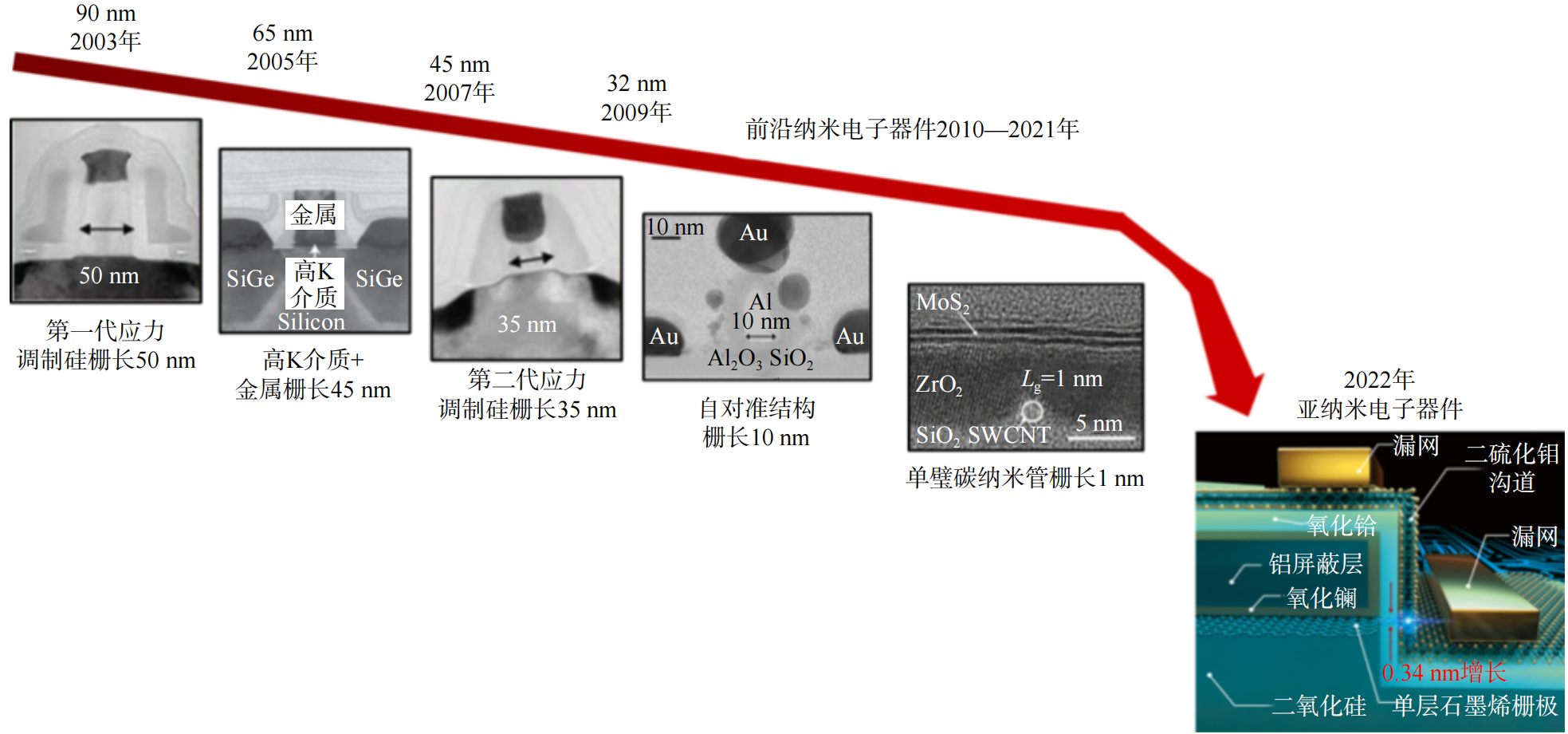 最后,二维材料制造的沟道厚度仅有几个原子层,栅极与沟道之间的势垒宽度将大幅压缩,通过高介电常数栅介质可提升势垒高度,而势垒宽度和高度可以影响量子隧穿的穿透概率,使用二维材料理论上可以将隧穿电流降低,达到硅基器件的千分之一以下。如图1所示,二维材料可以突破传统晶体管沟道和物理栅长的极限。