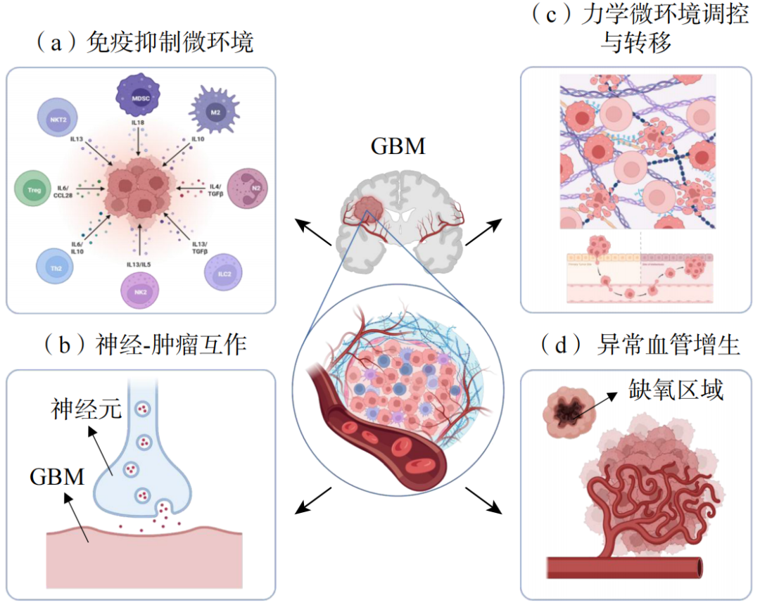 GBM的肿瘤微环境(TME)由肿瘤细胞、免疫细胞、神经元、胶质细胞、血管系统、细胞外基质(ECM)及多种细胞因子与趋化因子等组成,协同驱动其恶性表型的维持和进展,如图1所示。
