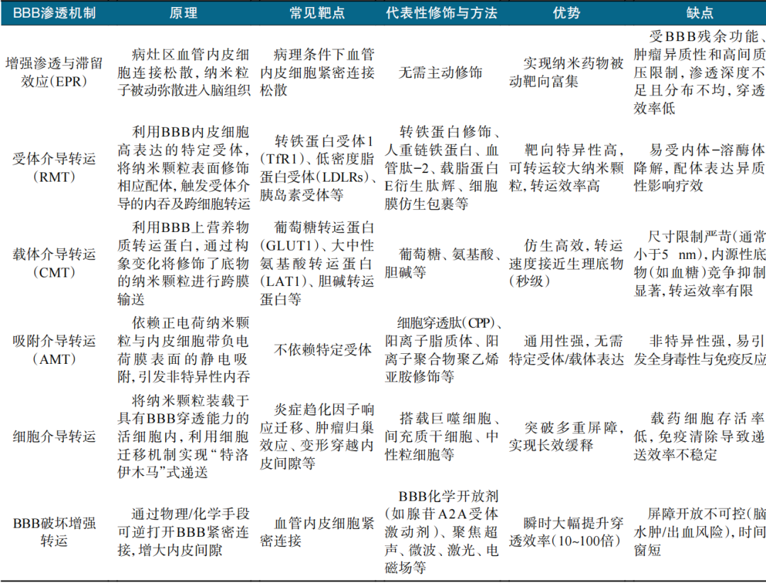 另一方面,纳米颗粒可通过化学修饰或物理干预等方法通过受体介导转运(RMT)、载体介导转运(CMT)、吸附介导转运(AMT)、细胞介导转运及局部BBB结构破坏增强转运等方式显著提升其穿越效率,见表1。