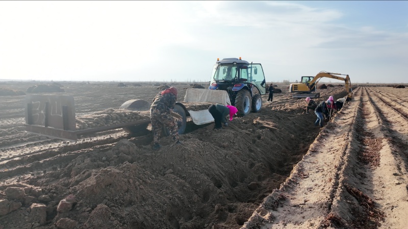 初冬时节,寒意渐浓。在平罗县陶乐镇庙庙湖村的山药种植基地里,却是一派热火朝天的丰收景象。11月13日,伴随着挖机的隆隆轰鸣,“铁爪子”深入沙地刨开土层,一根根粗细均匀的山药破土而出,紧随其后的务工村民们眼疾手快,小心翼翼地将这些“金疙瘩”从泥土中拔出,抖落掉山药上的沙土后整齐地码放。山东客商张安山的平板车在田垄间缓缓行驶,车厢内山药整齐堆放,即将发往全国各地。