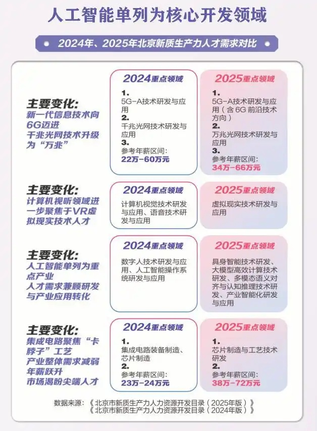 新京报记者对比发现,与2024年相比,今年《目录》核心开发领域从60个精简至58个,人工智能从新一代信息技术中独立成列;同时,“专家”一词出现频次由28次增至31次,参考年薪区间整体上移。这些变化释放出明确信号——北京的人才需求正进一步向尖端人才聚焦。