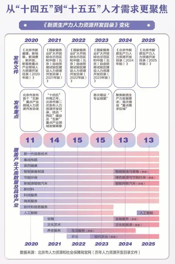 2024年目录升级为《新质生产力人力资源开发目录》,并在2025年继续更新。从设定人才需求评级,到增设重点需求专业及重点需求区域,目录体系逐步完善,已成为北京人才供求市场的重要“晴雨表”。