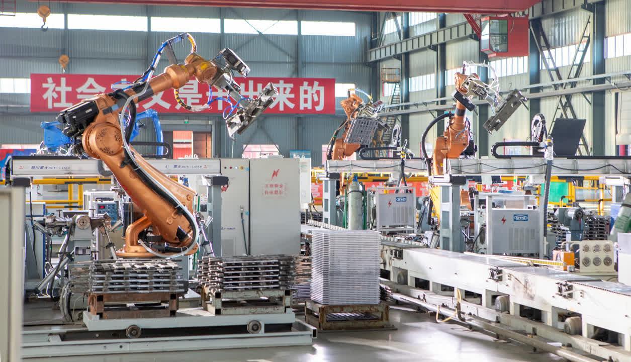 智能机械手臂在制造阳极板。