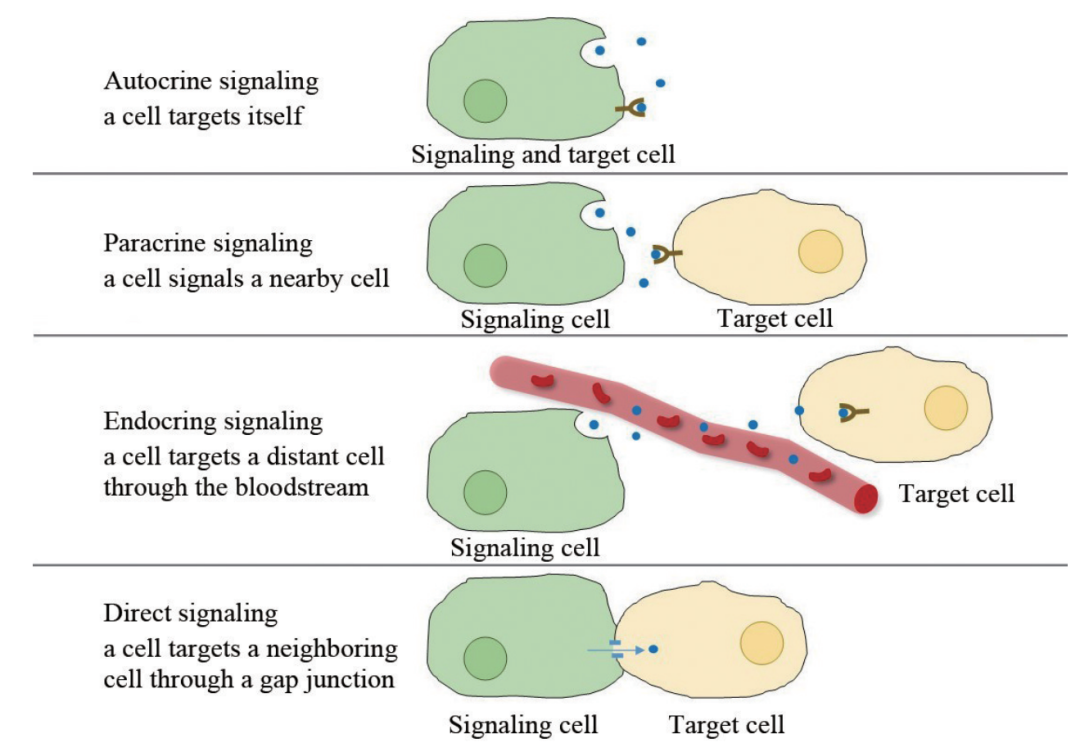 在化学信号传导中,细胞可能以自身、附近的细胞、远处的细胞或通过间隙连接的细胞为目标(图片来源:罗杰威廉姆斯大学官网)