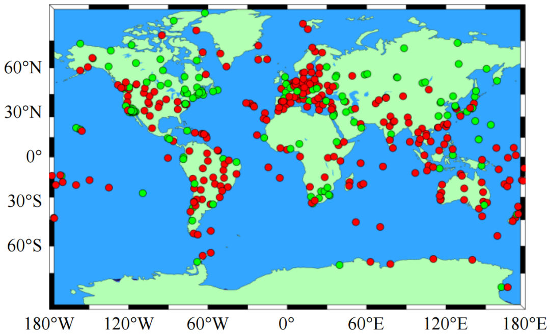 随着GNSS系统的蓬勃发展,地面跟踪站作为支撑高精度PNT服务的关键基础设施,其规模和信号跟踪能力正持续扩展。截至2025年4月,国际GNSS服务组织(IGS)公布的全球公开站点数已超过520个,形成覆盖全球、密度适中的GNSS连续跟踪网络,站点分布如图1所示。