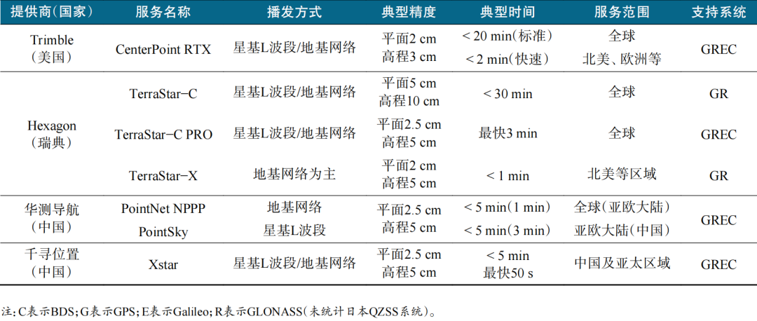 随着无人驾驶、智慧农业、低空经济等新兴领域对高精度定位需求的持续提升,商业PPP服务逐步走向成熟。典型的PPP商业服务提供商包括中国的千寻位置、华测导航、美国Trimble以及瑞典Hexagon等,典型技术特征见表3。