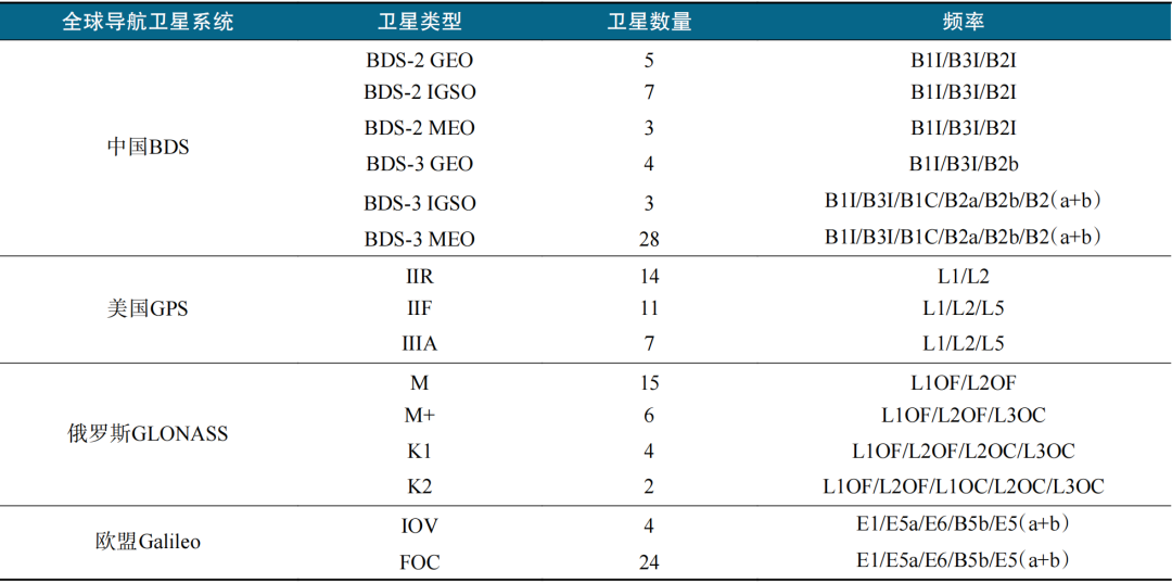 截至2025年4月,4大全球导航卫星系统的在轨运行卫星总数已达140颗,构建了全球高可用、高冗余的卫星导航服务能力,各系统的星座构型、在轨卫星数及播发频率见表1。